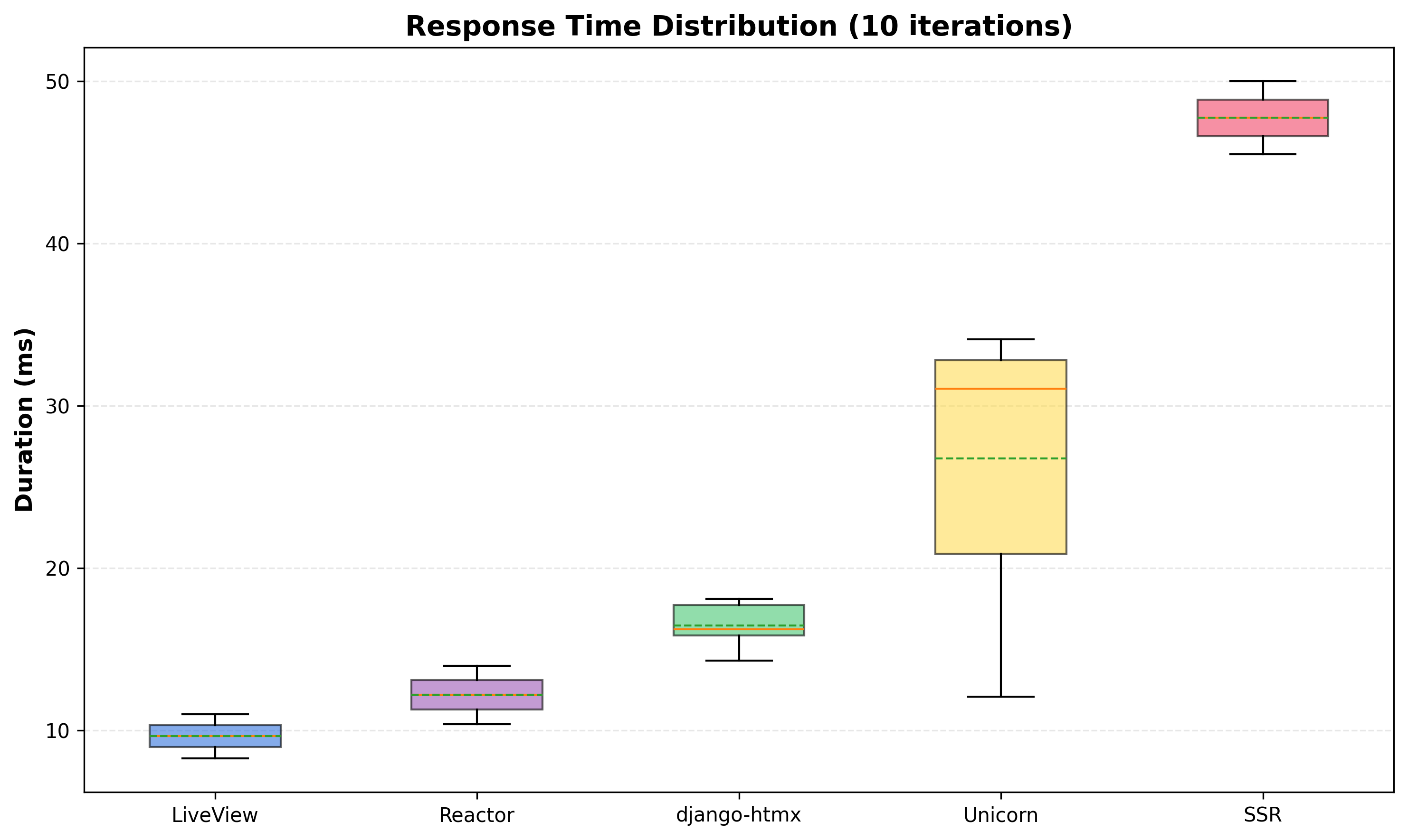- Add sort_by_performance() function to sort implementations by average duration - Update all plots to display frameworks from fastest to slowest - Order: LiveView (9.35ms) → Reactor (12.00ms) → django-htmx (16.48ms) → Unicorn (26.76ms) → SSR (47.25ms) - Regenerate all 9 performance plots with sorted order
