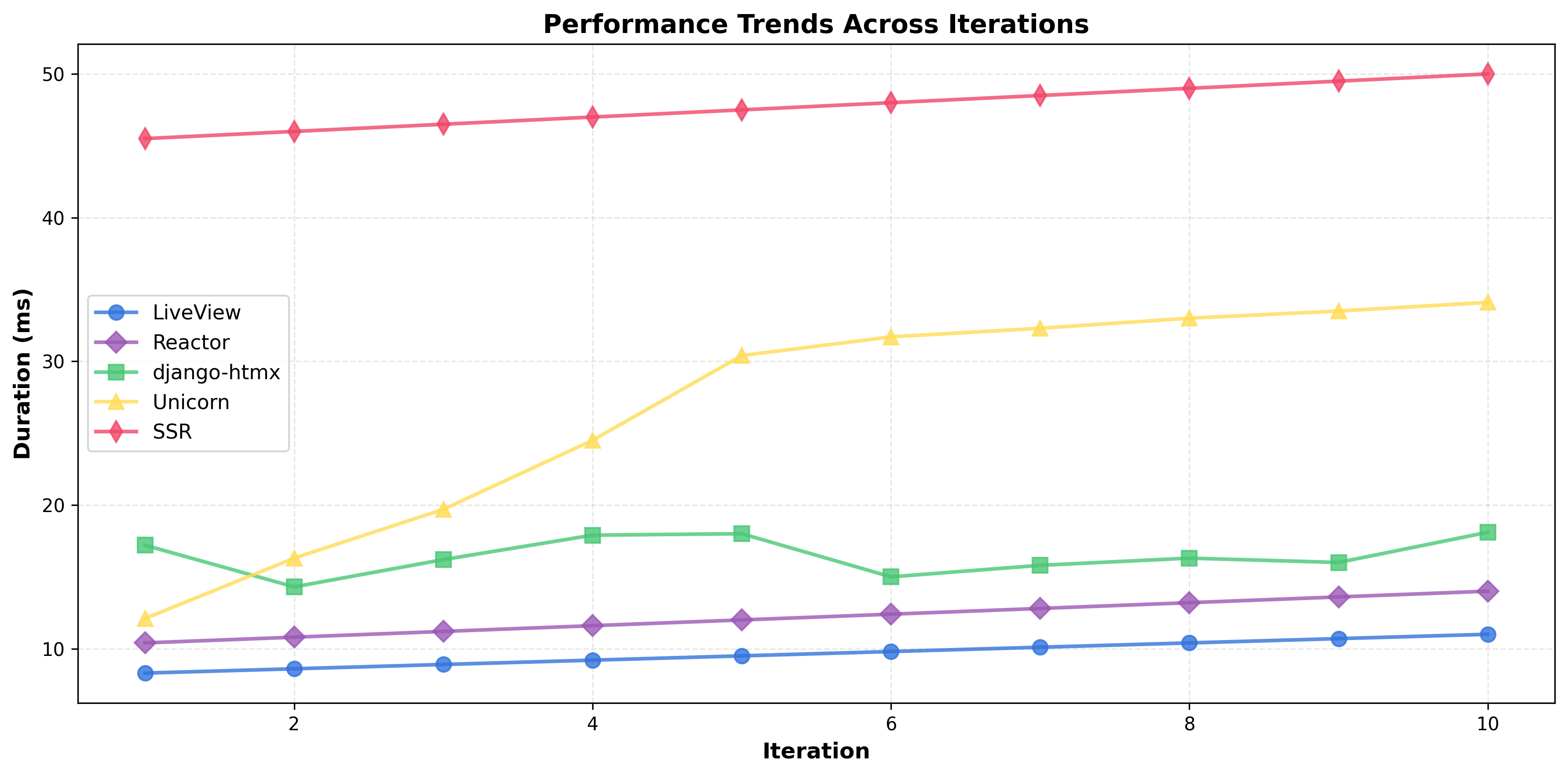- Add sort_by_performance() function to sort implementations by average duration - Update all plots to display frameworks from fastest to slowest - Order: LiveView (9.35ms) → Reactor (12.00ms) → django-htmx (16.48ms) → Unicorn (26.76ms) → SSR (47.25ms) - Regenerate all 9 performance plots with sorted order